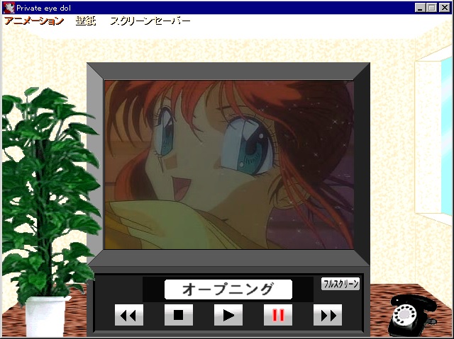 Screen Saver 3 (Can be viewed at 3:06): Text that reads “Private Eye Dol Screen Saver,” or “Private Eye Dol スクリーンセーバー” to be exact, scrolls across the screen and shows the picture in the background. Once finished, it briefly displays the full picture, then repeats with the next image.