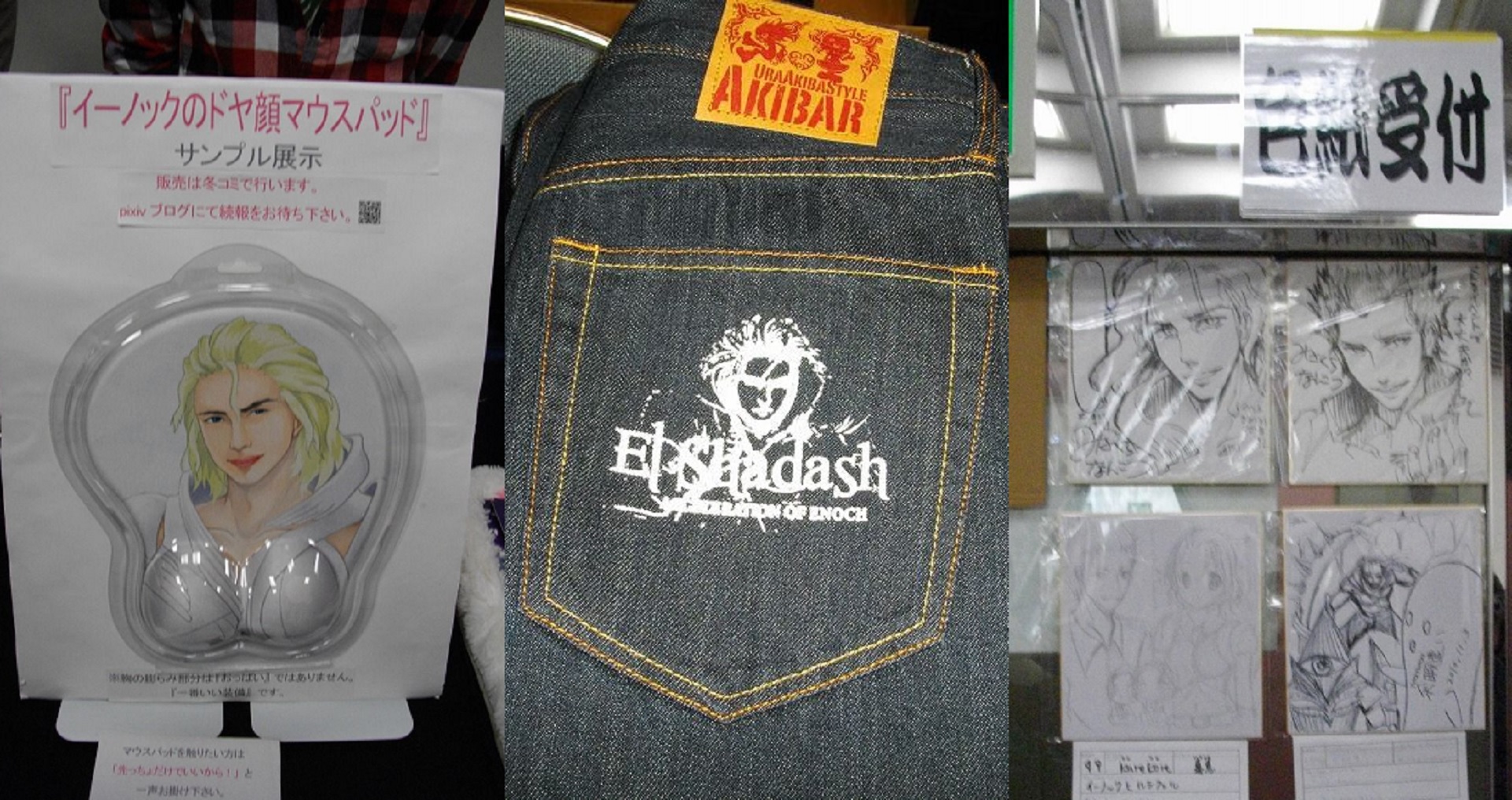 According to a live blog about El Shaddai Only – it was fairly popular, especially among women. Some of the goods being sold included Jeans (not to be confused with the official ones sold later), an Enoch bust mouse pad, various bits of art, in addition to games. Keep in mind El Shaddai wasn’t even out at that point, yet people were already making their own parody versions.