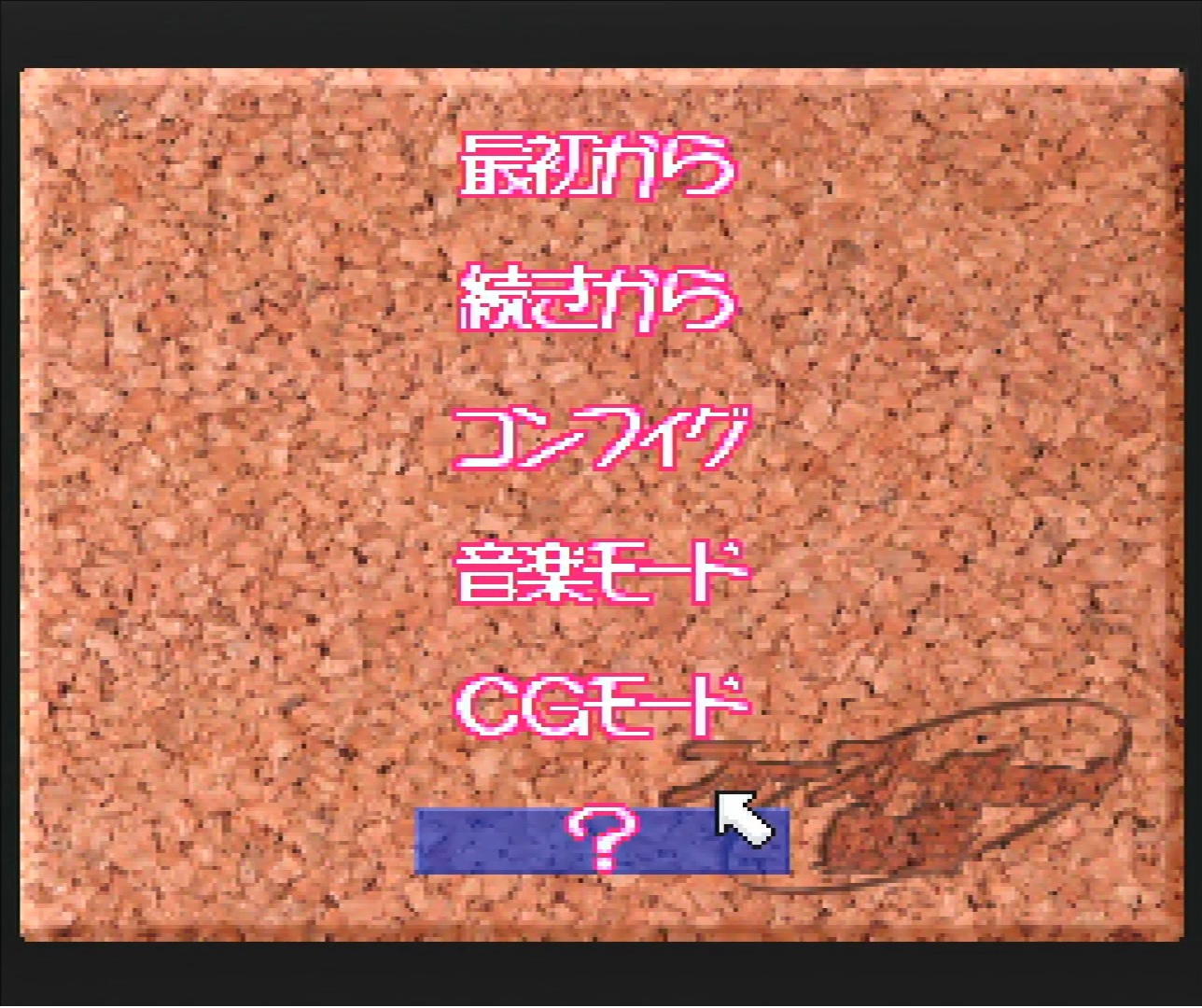 Once the game loads, press your equivalent to the “Run” button to get through the title screen. Select the “?” menu option to load HuneX Fighters ’98.