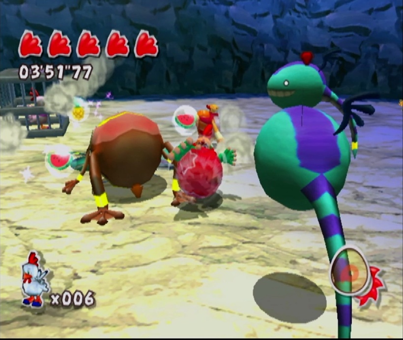 The Egg’s capabilities can be enhanced by rolling over fruit, increasing its size and damage output. However it’s not something you always want to do, since the larger it is, the harder it can be to navigate small platforms. It can also increase the likelihood foes will hit it, or the chances that weird buggy stuff will happen. These trade off mechanics, intentional or not, create a neat sense of choice in the size of the egg the player wants to utilize.