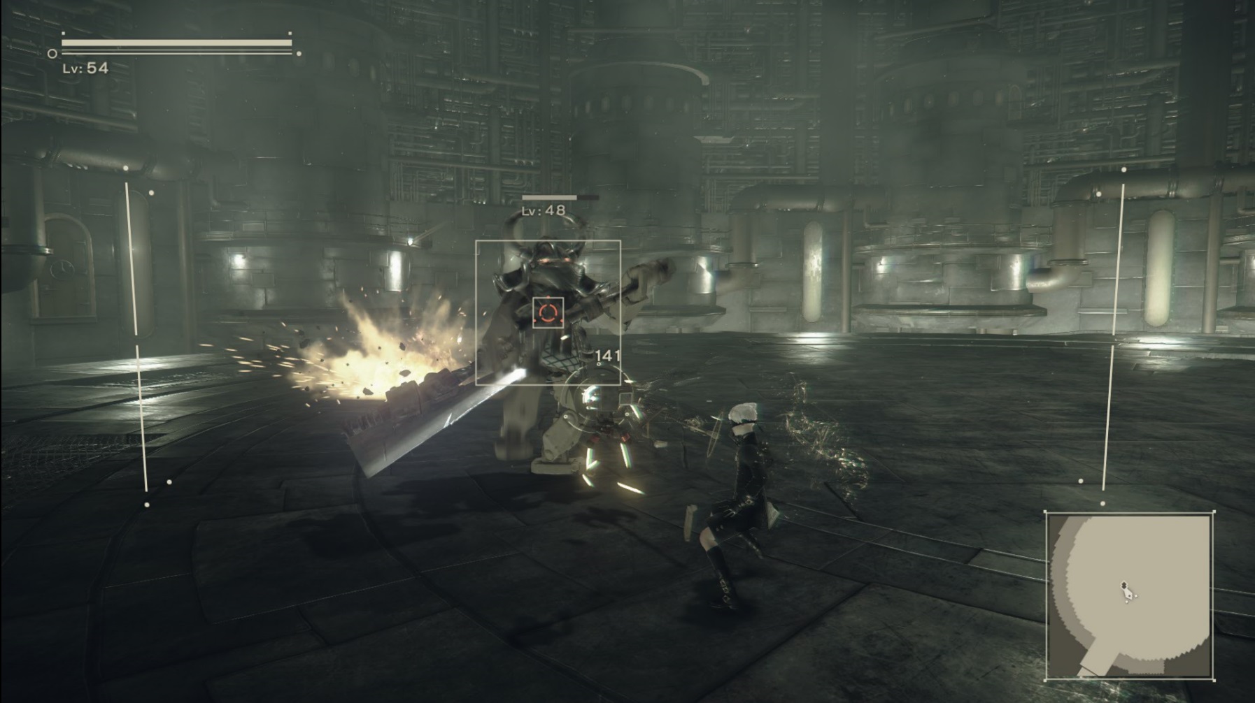 Automata frequently swarms the player with a dozen or more enemies at a time. It makes sense to unlock the camera from a single foe to perform crowd control. Yet, the game seems to have a hard time disconnecting from a target. Likely in attempt to keep foes within reach to optimize combos, even undoing the lock-on feature will leave a softer automatic targeting system that prioritizes enemies. No matter which way you hold the analog stick, your attacks will be directed at the foe that is invisibly determined as the prime target.
